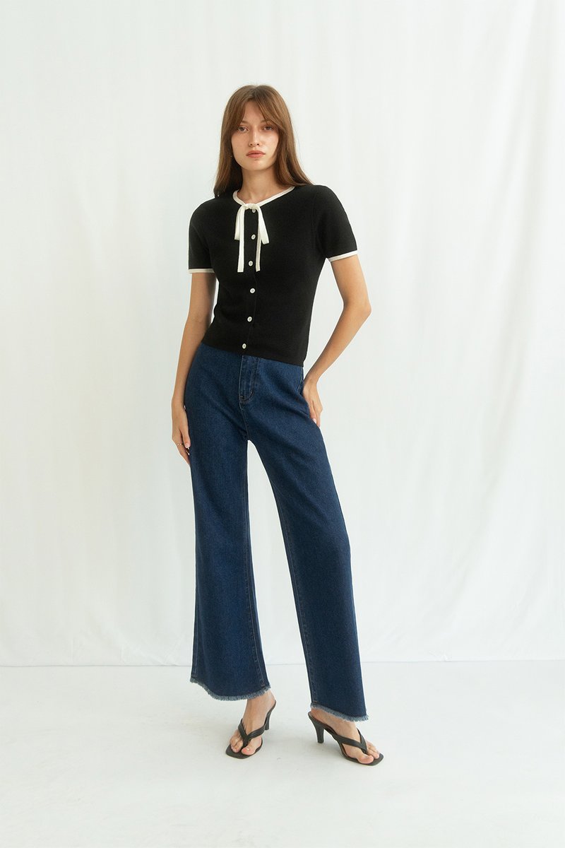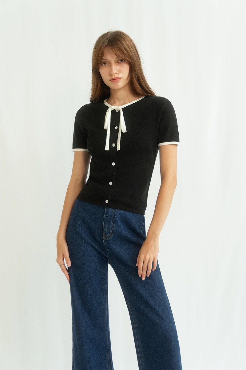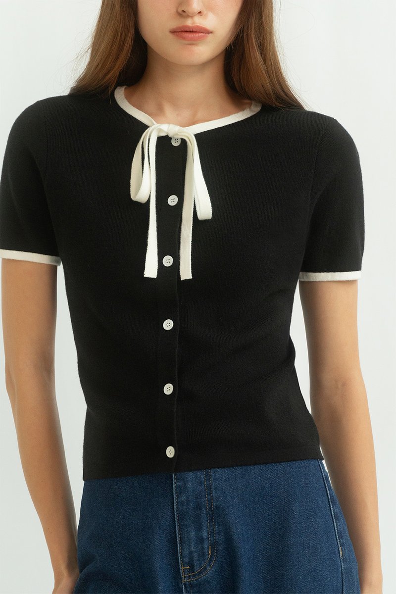 Made of soft knit, unlined and stretchable. Comes with a self-tie ribbon at the front and functional button down closure.