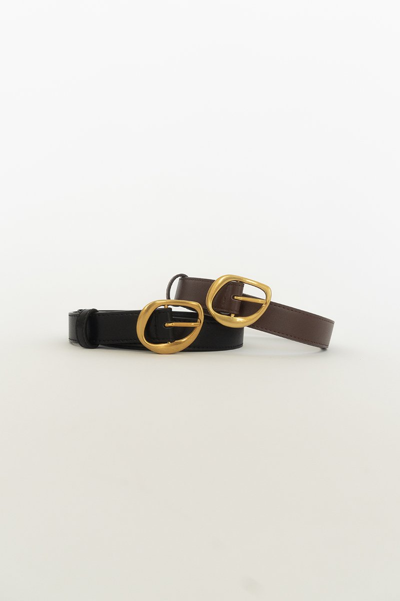 Made of PU leather with gold-tone hardware. Features a rounded teardrop-shaped buckle and a slim adjustable strap.