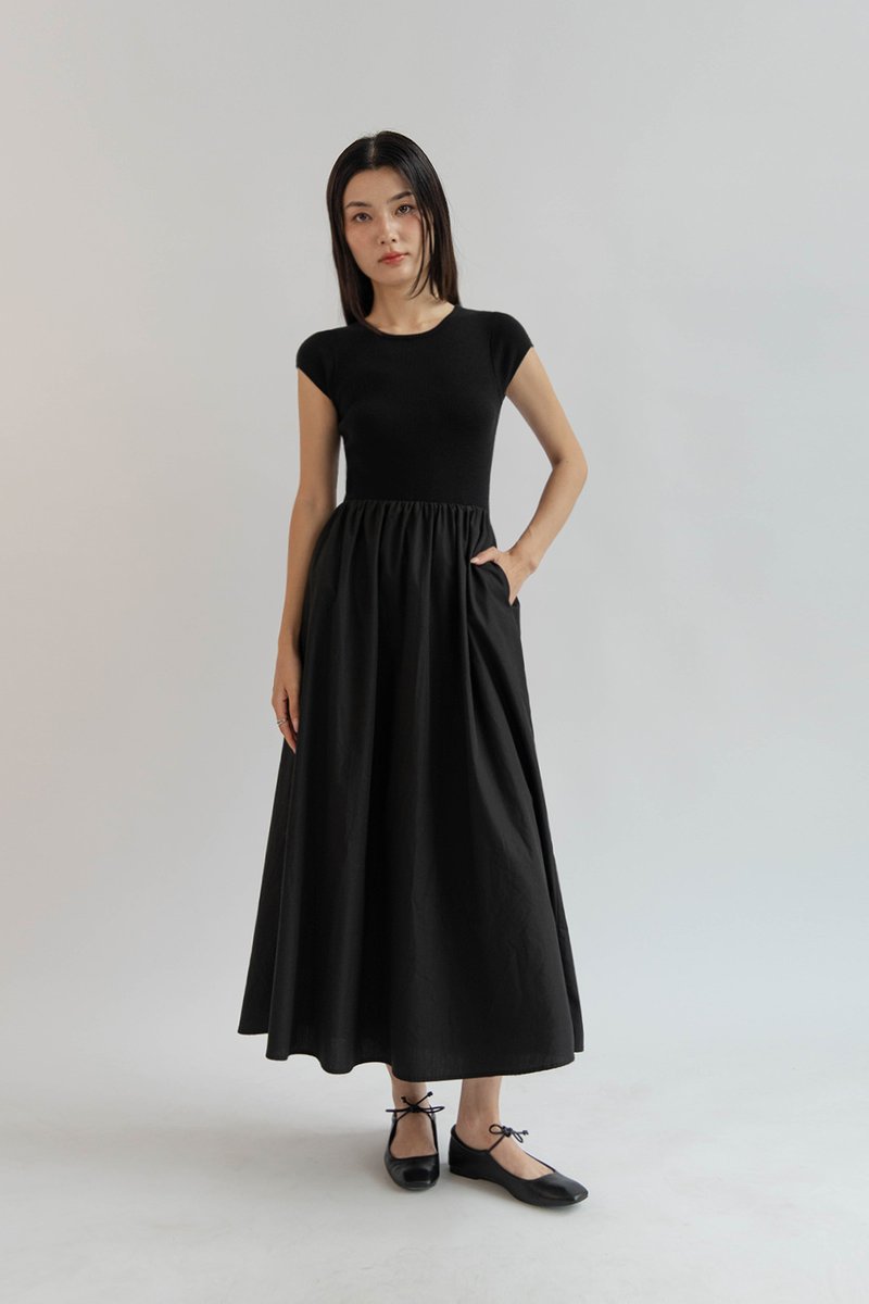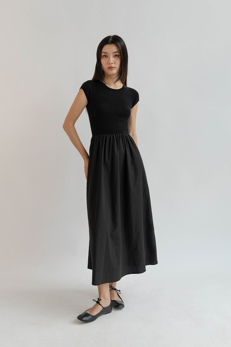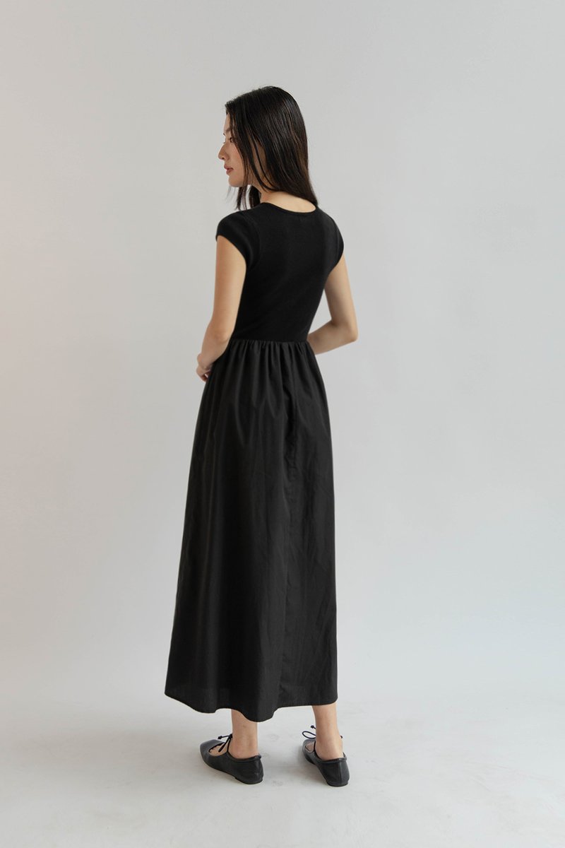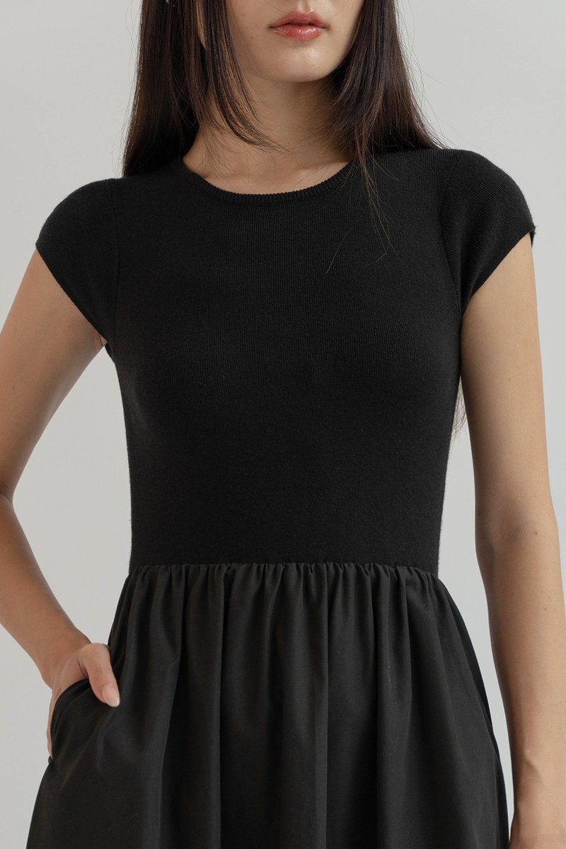 KATIE CAP SLEEVE MIXED MATERIAL DRESS BLACK