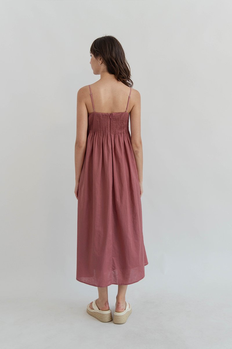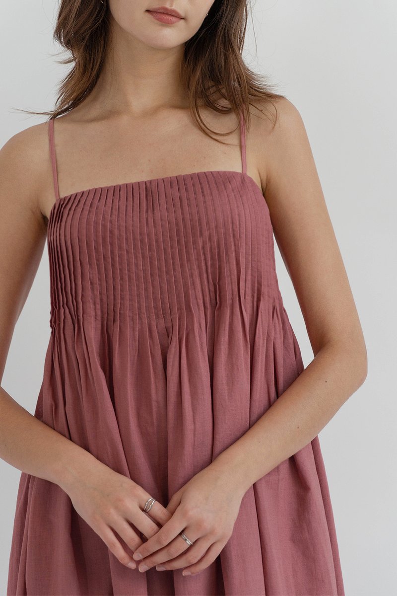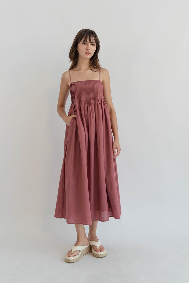 Made of linen, lined with no stretch except an elastic band all around the pit to pit area. Comes with functional side pockets, a concealed back zip and adjustable shoulder straps.