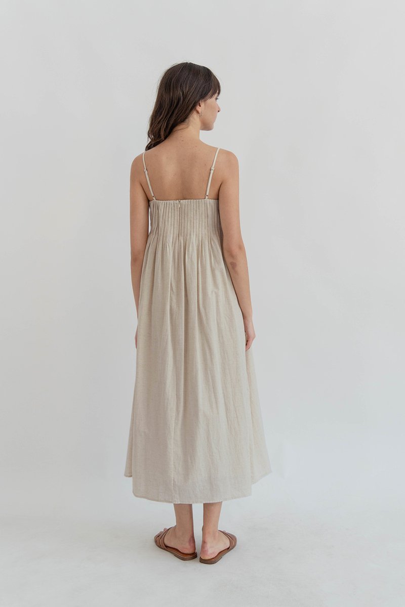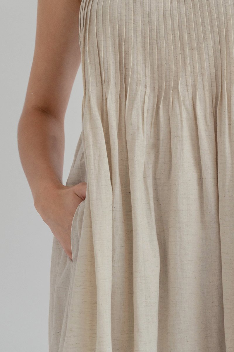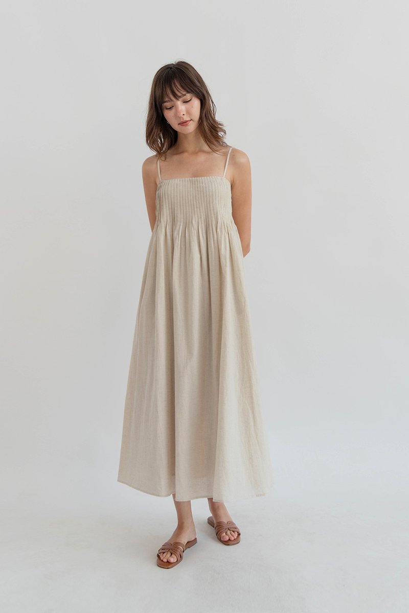 Made of linen, lined with no stretch except an elastic band all around the pit to pit area. Comes with functional side pockets, a concealed back zip and adjustable shoulder straps.