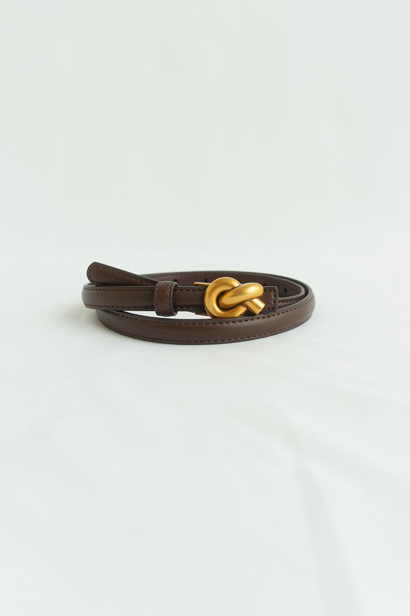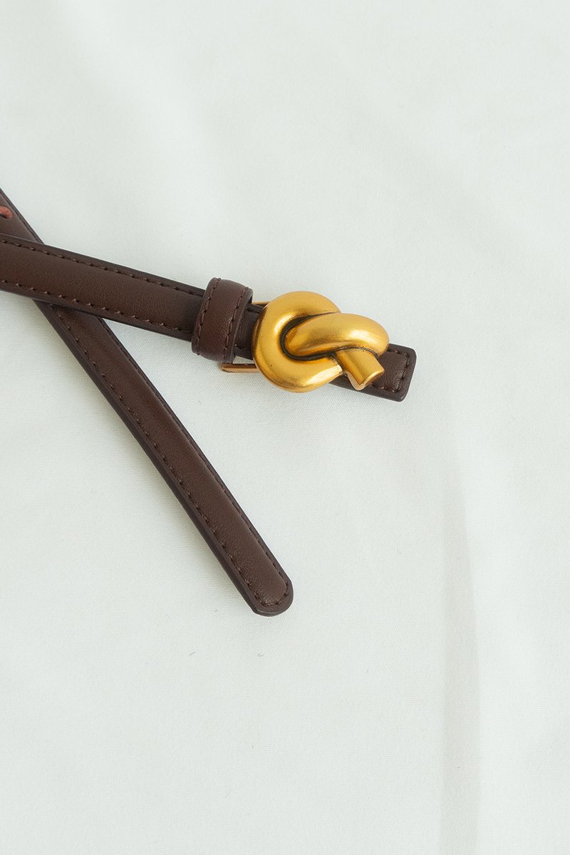 Made of PU leather with gold-tone hardware. Features an irregular knot-shaped buckle and a slim adjustable strap.