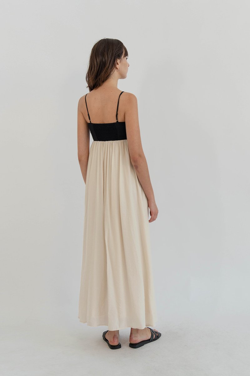Made of cotton tencel, lined with no stretch except for a partially smocked back. Comes with functional side pockets, a concealed side zip and adjustable shoulder straps.