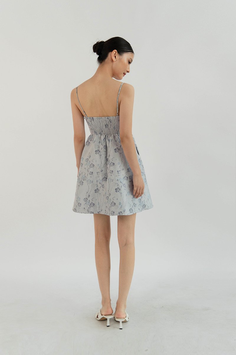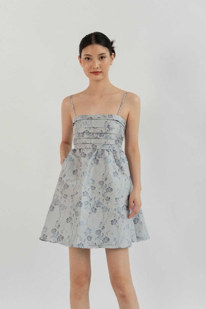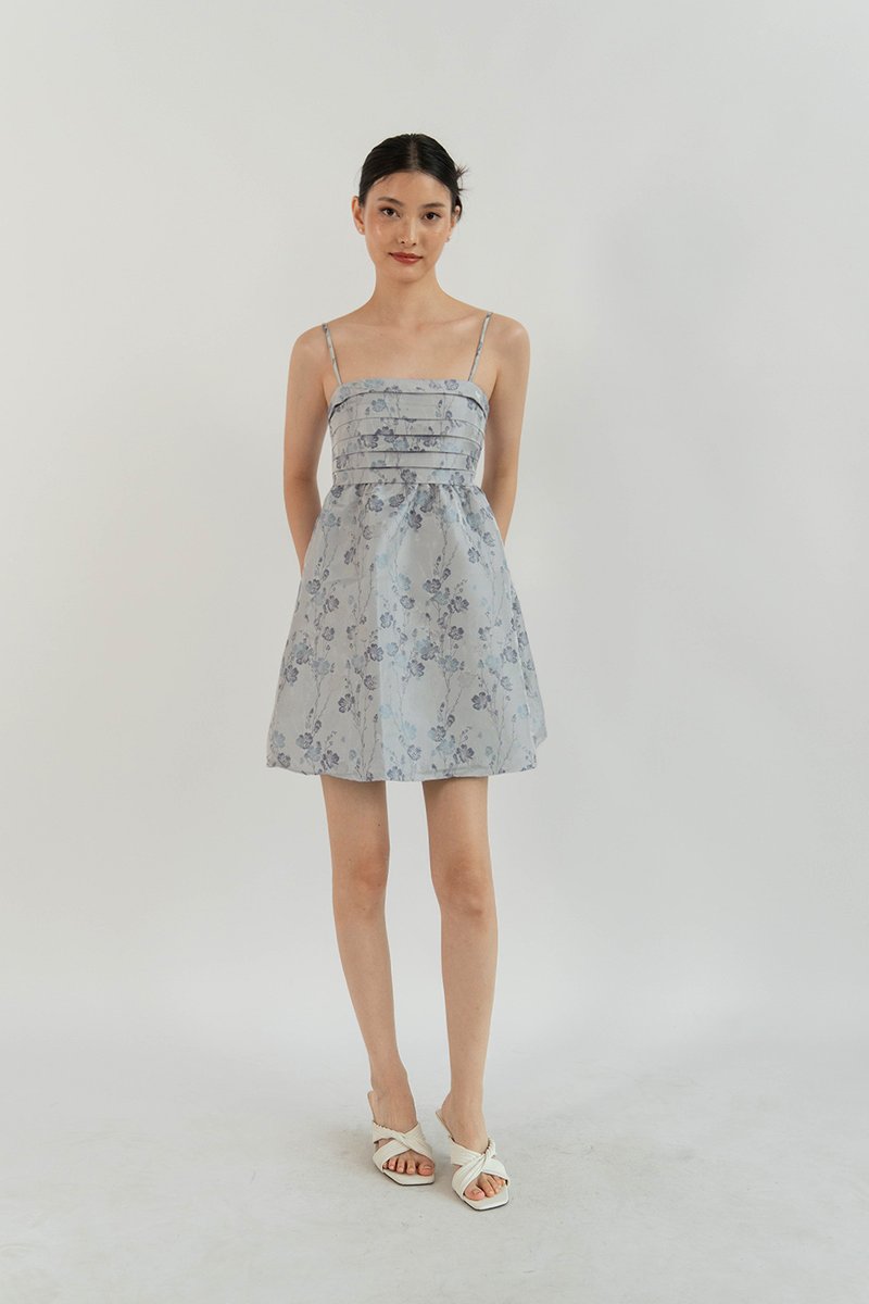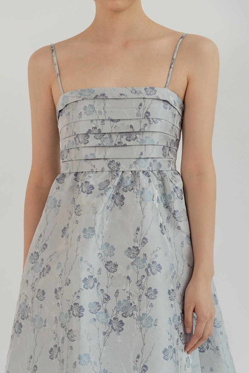 Made of jacquard, lined with a partial smocked back and adjustable shoulder straps. Comes with concealed side zip and functional side pockets. Pleats at the bodice are sewn down individually.