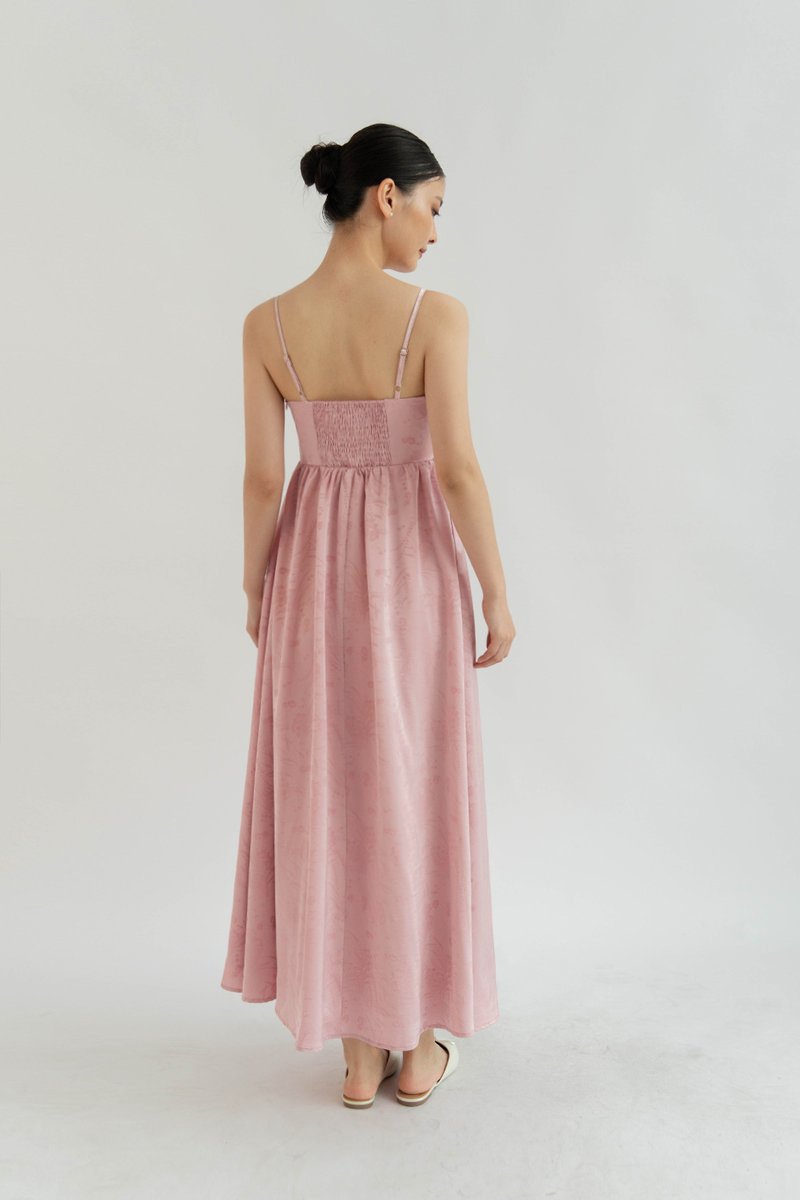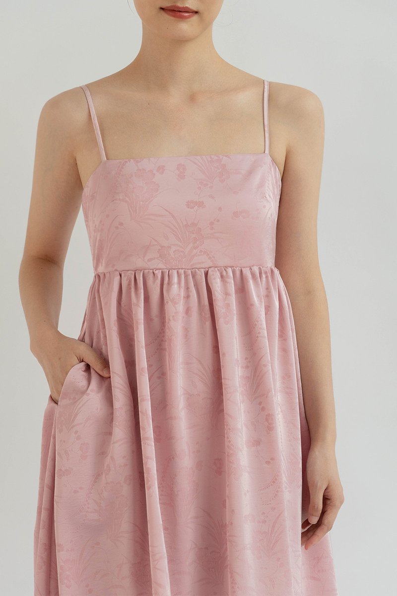 Made of soft brocade, lined with no stretch except for a partially smocked back. Comes with functional side pockets, a concealed side zip and adjustable shoulder straps.