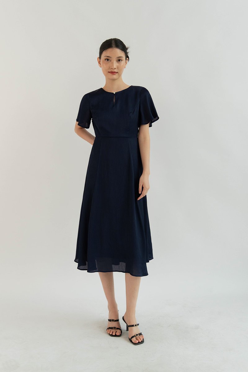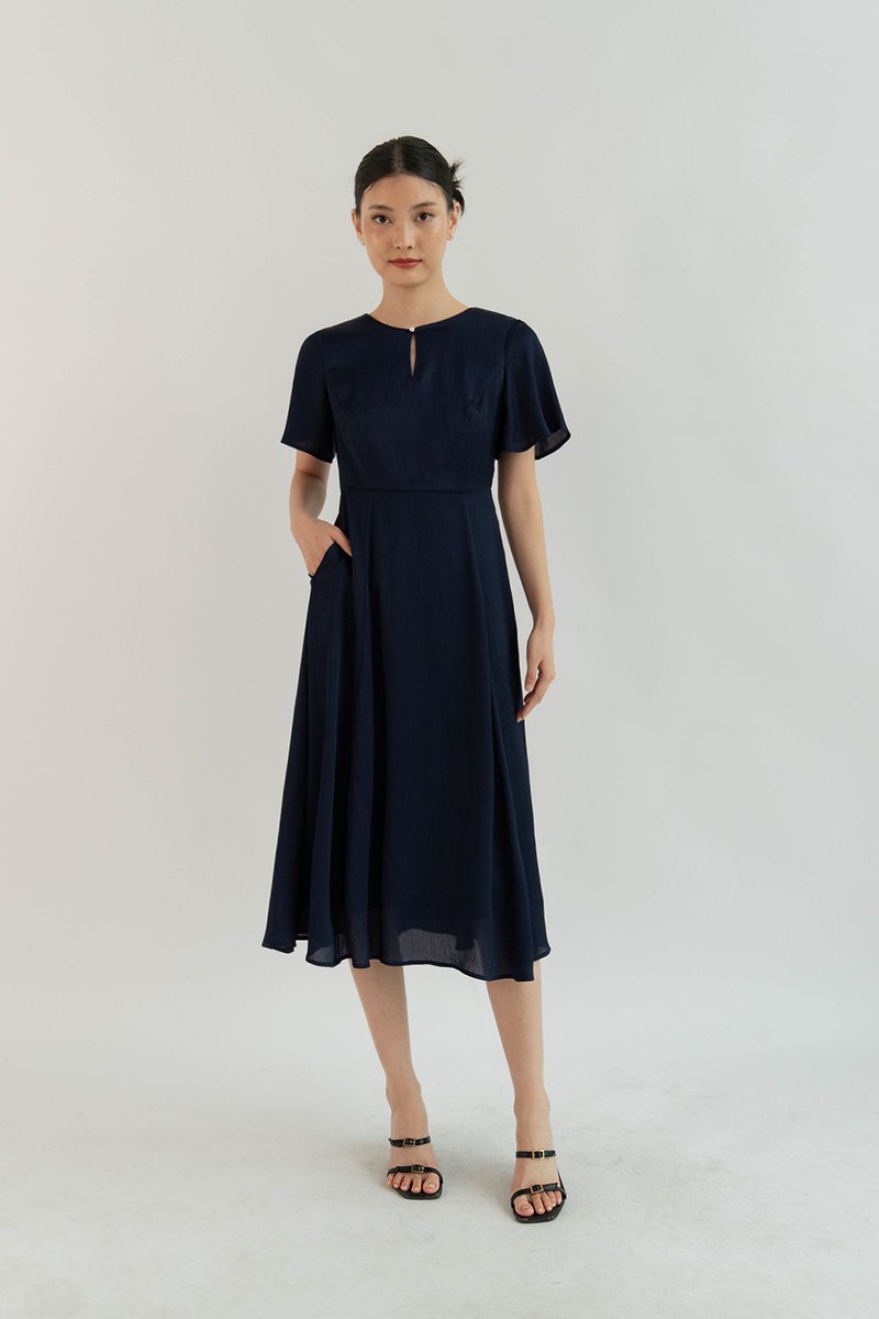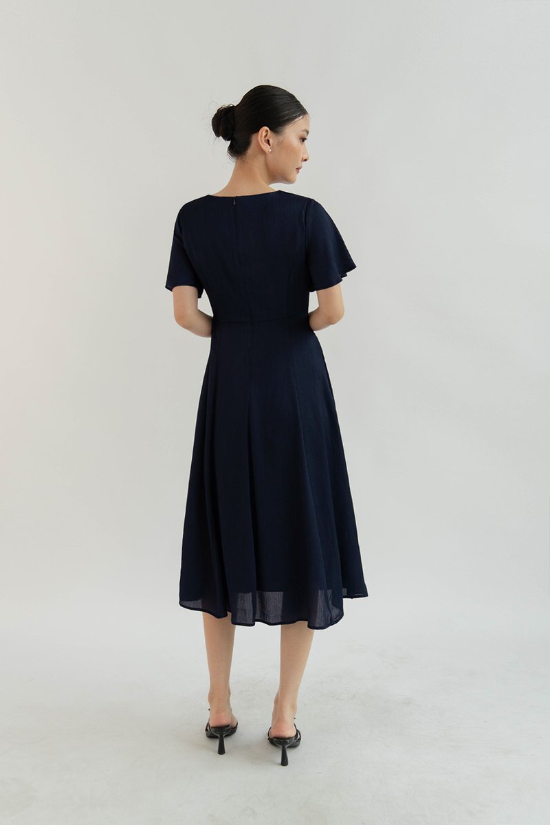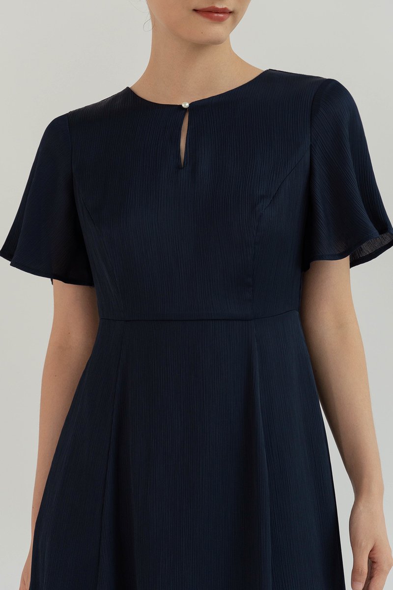 Made of textured crepe cotton polyester, lined with no stretch. Comes with functional side pockets, a concealed back zip and functional button closure at neckline.
