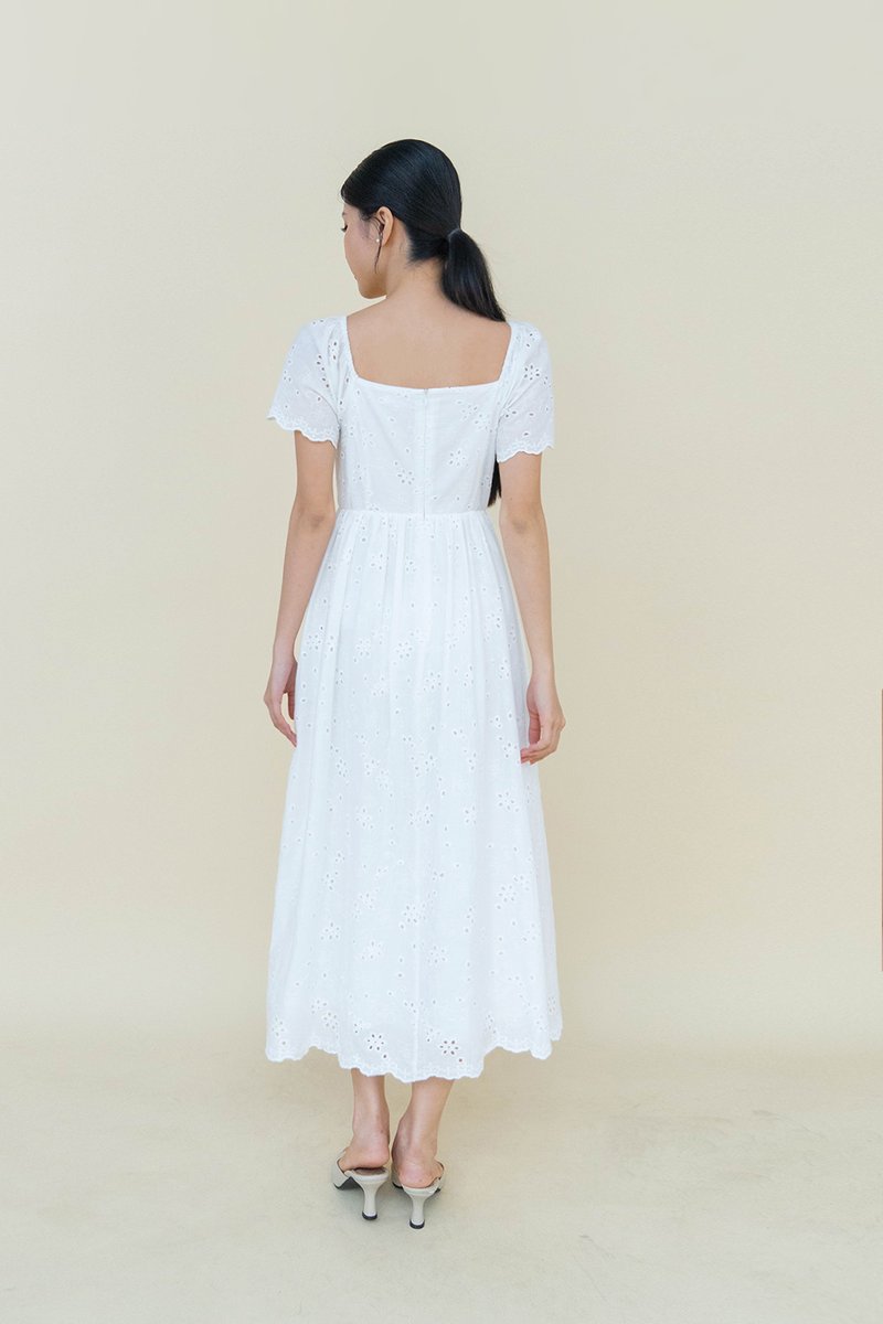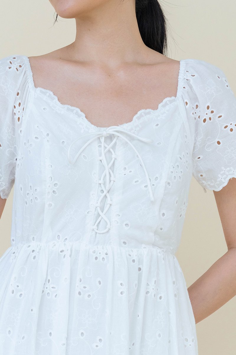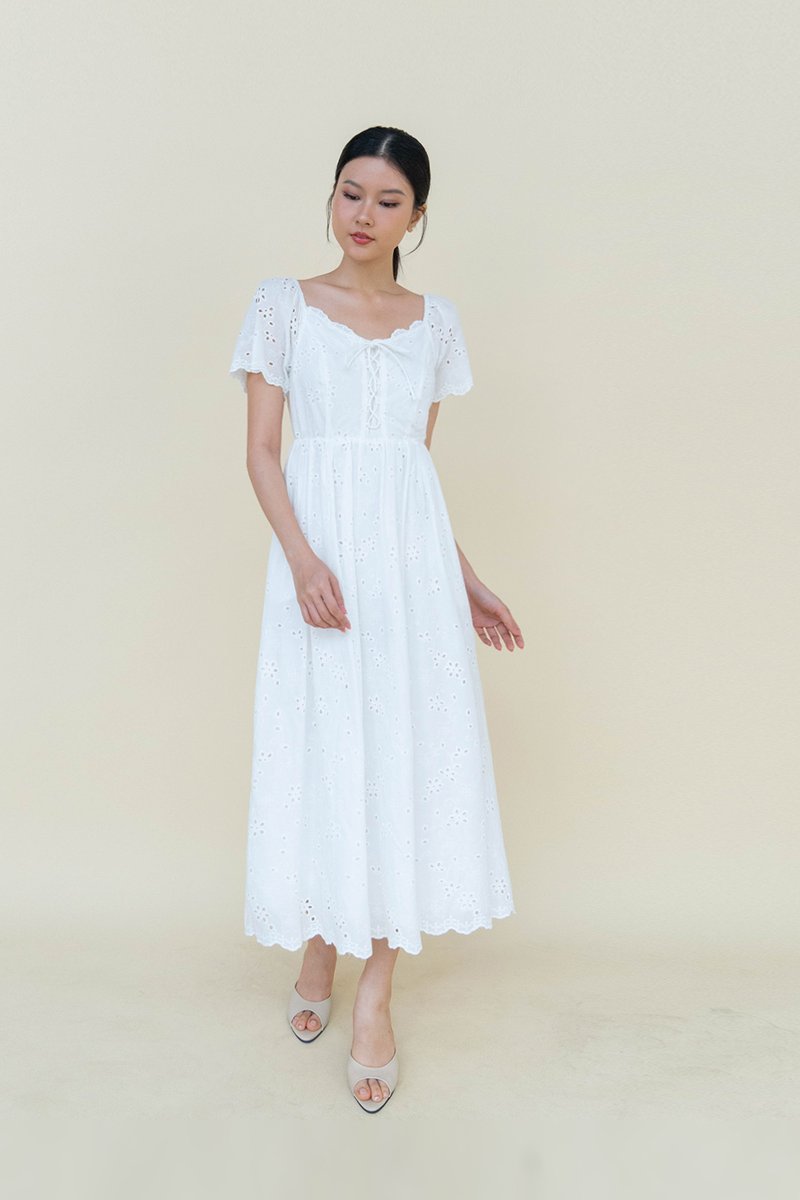 LILIA EYELET FLUTTER SLEEVE DRESS WHITE