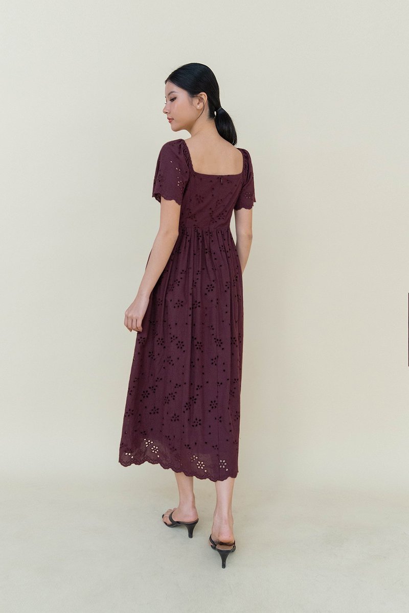 LILIA EYELET FLUTTER SLEEVE DRESS WINE