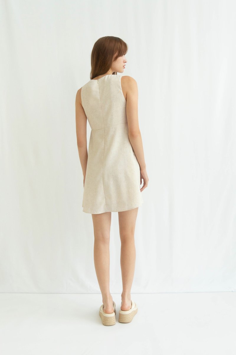 Made of linen with crochet details, lined with no stretch. Comes with functional side pockets and a concealed back zip.