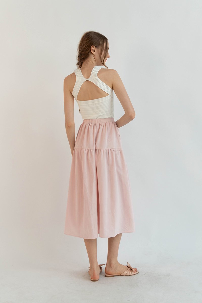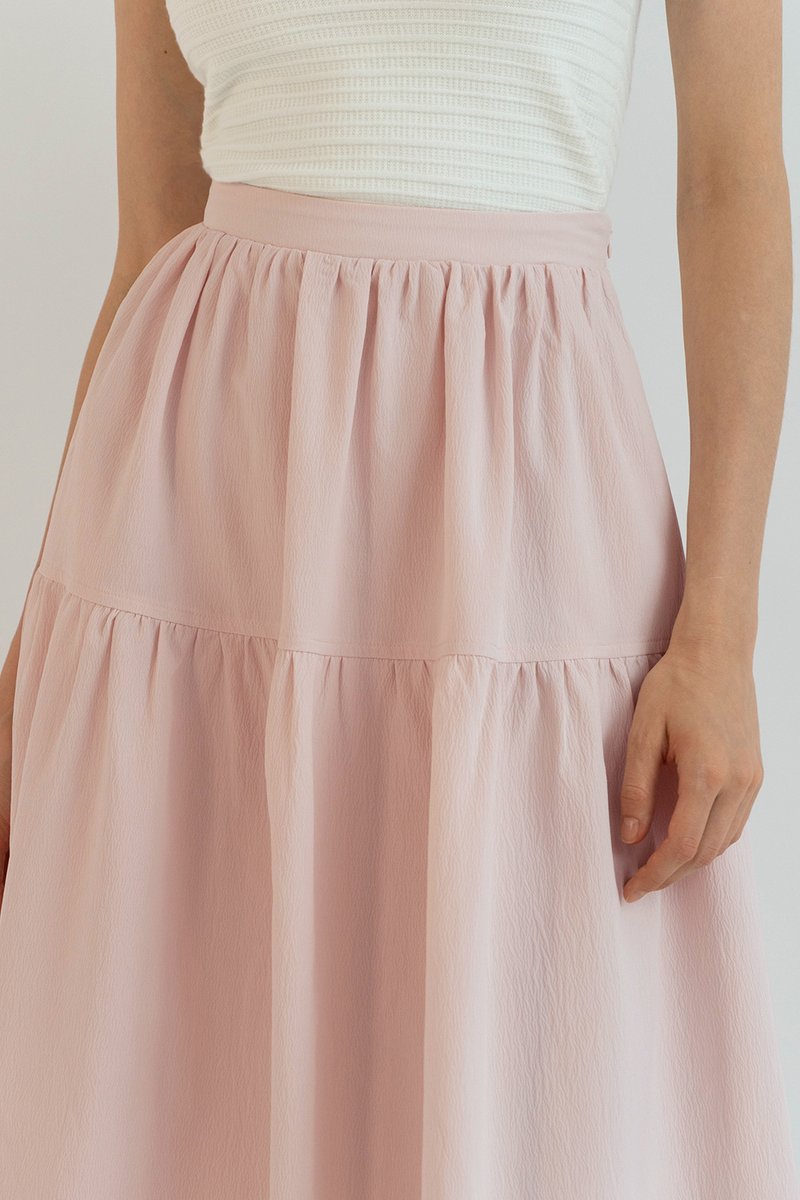 Made of textured cotton polyester, lined with no stretch except partial elastic band at the back of waist. Comes with functional side pockets and a concealed side zip.
