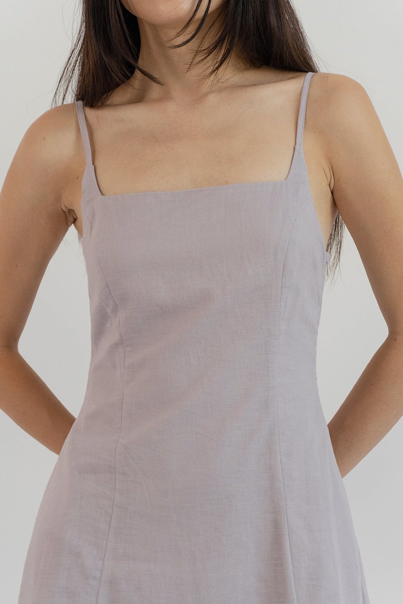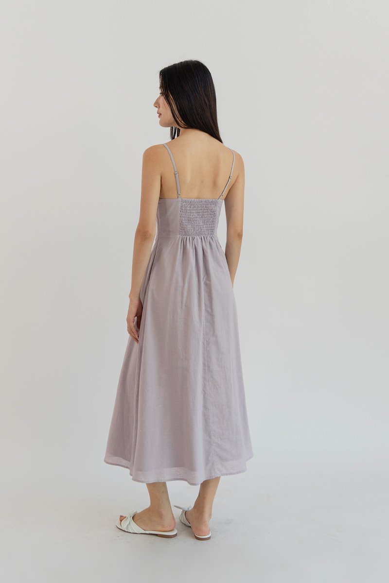 Made of linen, lined with no stretch except partial smocked back. Comes with functional side pockets, a concealed side zip and adjustable shoulder straps.
